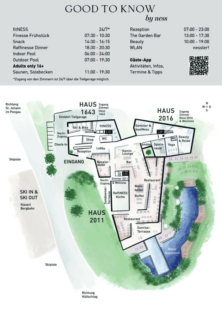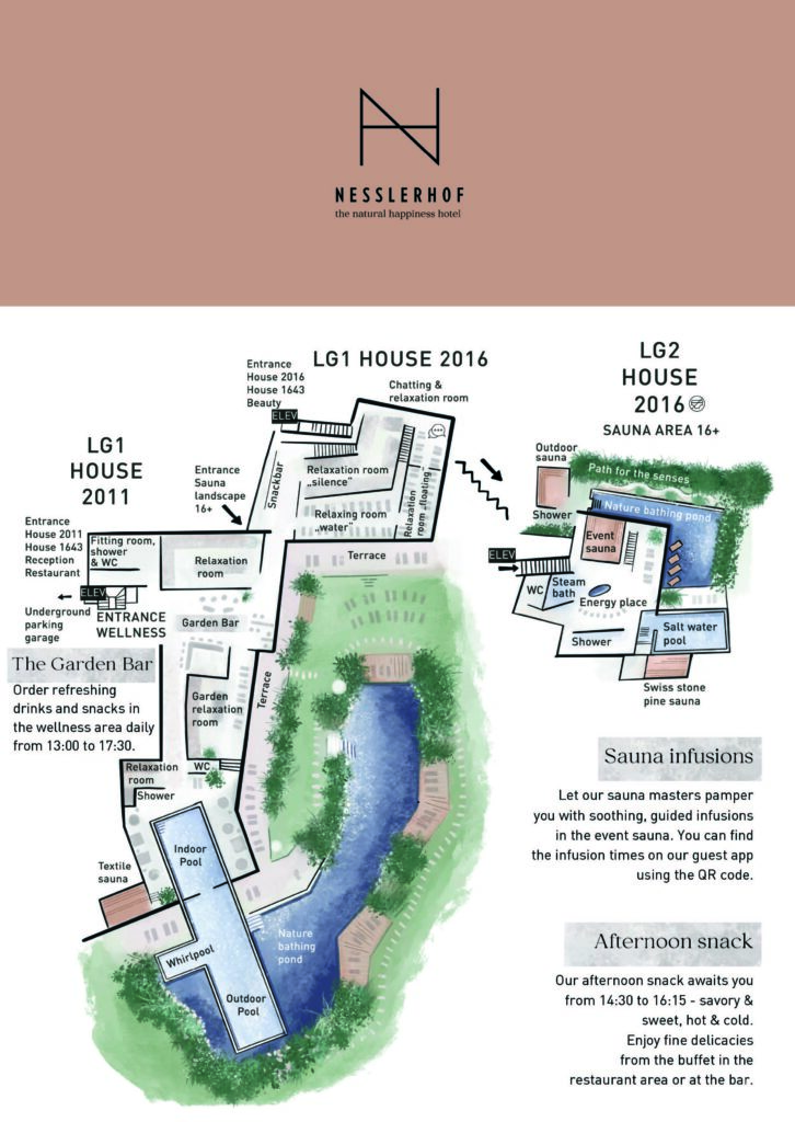 Im Jahr 2023 wurde das Hotel Nesslerhof in Großarl stilvoll umgebaut und erweitert. Nach der Anreise verschafft der Orientierungsplan einen einprägsamen Überblick des Hotels.